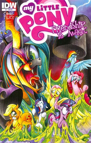 Creo que tiene dos defectos muy grandes. Para empezar el dibujo, es un poco feote. Me saca mucho de la historia el hecho de que lo que estoy viendo se parece a la serie, pero no es la serie. Y el segundo es que la ambientación es completamente distinta, ya sean los personajes secundarios (esas arañas parecen sacadas de un comic de Disney), que Chrisalys esté completamente fuera de su personaje (aqui es un malo de opereta que no logra hacer bien nada y que para colmo las Cutie Mark Crusader la torean como quieren), que de fondo los ponies estén poniendo caras todo el tiempo (da igual lo dramático de la situación, parece que ninguno se lo toma en serio) y que hay demasiadas referencias metidas con calzador (esa escena de las puertas del último número me parece atróz; la serie es muy referencial, pero no tanto). La historia tampoco es nada del otro mundo, de hecho el final